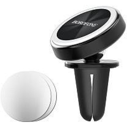 Модель выполнена в стиле минимализм, отлично сочетается с большинством салонов авто. Специальное крепление держателя позволяет выбирать максимально удобный угол обзора экрана. Доступ к кнопкам, разъемам и функциональным элементам гаджета сохраняется во время эксплуатации аксессуара. Держатель изготовлен из металла высокого качества. Надежная магнитная фиксация, предусматривает установку специальной пластины под заднюю крышку телефона или чехла. Аксессуар крепится зажимом на решетку системы вентиляции в салоне автомобиля. В комплекте две металлические пластины.