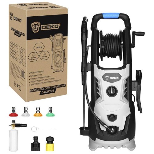 Мойка высокого давления DEKO DKCW235 предназначена для мытья транспортных средства (машин, лодок, мотоциклов и т.д.), очистки загрязненных поверхностей при помощи чистой воды под высоким давлением (при необходимости с добавлением моющих средств) в бытовых условиях. Мойка оснащена функцией Автостоп. Надежная алюминиевая помпа имеет небольшой вес и не подвергается процессу коррозии. Мойка может забирать воду из любого подходящего источника - водопровода, садовой бочки или водоема. Технические характеристики: Мощность: 2850 Вт Рабочее давление: 190 бар Макс. давление: 235 бар Давление в системе водоснабжения: 5 бар Макс. подача воды: 8.6 л/мин Класс защиты: IPX5 Возможность забора воды из емкости: да