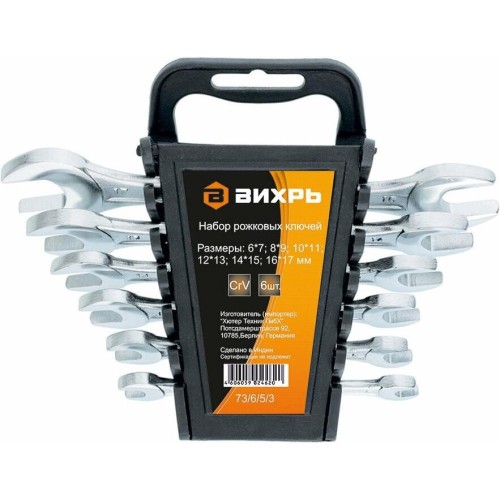 Набор рожковых ключей ВИХРЬ включает 6 гаечных ключей, изготовленных из хромованадиевой качественной стали. Имеют хромированное покрытие. Рожковый гаечный ключ - незаменимый инструмент при сборке и разборке любых металлических конструкций, эффективен для работы в труднодоступных местах. Размер ключей: 6 - 17 мм.