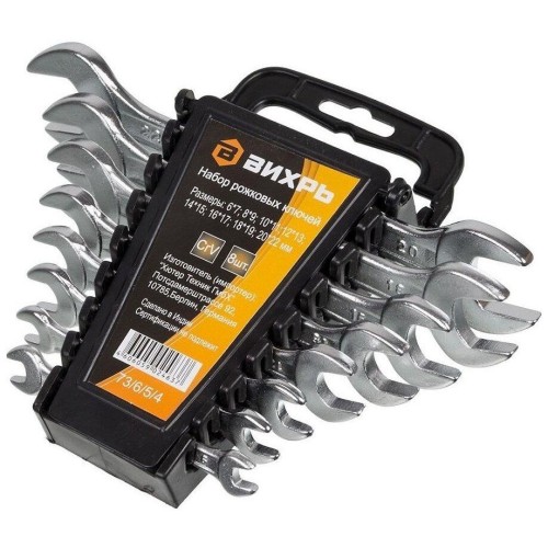 Набор рожковых ключей ВИХРЬ включает 8 гаечных ключей, изготовленных из хромованадиевой качественной стали. Имеют хромированное покрытие. Рожковый гаечный ключ - незаменимый инструмент при сборке и разборке любых металлических конструкций, эффективен для работы в труднодоступных местах. Размер ключей: 6 - 22 мм.
