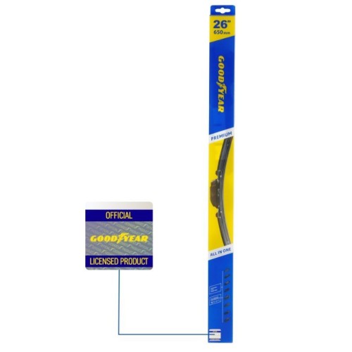 Уникальная система крепления адаптеров Clip Adapters (8 адаптеров на 11 видов крепления) позволяет использовать GOODYEAR PREMIUM на 99,8% всех моделей легковых автомобилей, в том числе с правым рулём Симметричный спойлер уникален в своём классе и выполнен из термопластичного эластомера, что делает его устойчивым к деформациям. Выполнен в виде литой конструкции и не имеет боковых заглушек, что значительно снижает обмерзание краёв щётки. Конструкция крепления лезвия имеет не только металлическую пластину на которой крепится лезвие, но и две дополнительные направляющие из нержавеющей стали, которые обеспечивают более прочное крепление резинового лезвия. Резиновое лезвие класса Triple A (ААА). Лезвие проходит процедуру полировки удаление шероховатостей поверхности.