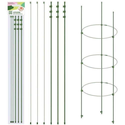 Опора используется для поддержки и фиксации в нужном положении стеблей и кроны растений. Кольцевая опора подойдет как для комнатных растений, так и для растений в саду. Опора устанавливается в цветочный горшок или открытый грунт. Опора состоит из трех колышков и трех прутиков, которые сворачиваются в кольца и фиксируются на колышках при помощи 9 зажимов. Кольца регулируются по ширине и высоте. Опора для цветов создает отличную поддержку для растений придавая им аккуратный, безупречный вид. Изготовлено из металла с порошковым покрытием, пластмассы (полипропилен). Размер: высота 90 см, максимальный диаметр колец 28 см.