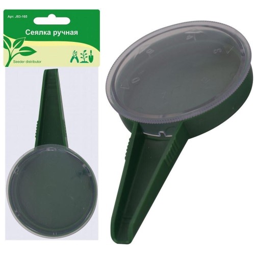Ручная сеялка предназначена для посадки семян, экономит время, позволяет отсеивать непригодные семена. Наличие отверстий разных размеров позволяет использовать приспособление для посева разных культур. Изделие состоит из двух частей — контейнера с носиком и прозрачной крышки с отверстиями разного размера. Изготовлено из пластмассы (ABS). Инструкция: Откройте крышку и засыпьте в контейнер необходимое количество семян. Поверните крышку. Выберите отверстие нужного диаметра. Равномерно высейте в грядку семена.