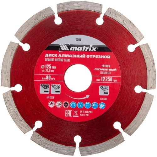 Алмазный отрезной сегментный диск Matrix 73173 диаметром 125 х 22,2 мм предназначен для сухой резки натурального и искусственного камня, кирпича, свежего и твердого бетона. Применяется с углошлифовальными машинами соответствующего типоразмера.