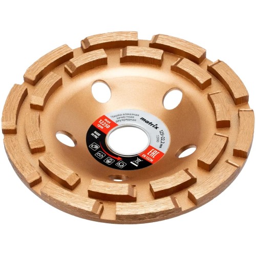 Двухрядная алмазная зачистная чашка Matrix 72990 диаметром 125 мм, с посадочным отверстием 22,2 мм, — оснастка для углошлифовальных машин, предназначенная для грубой обработки бетонных, каменных, кирпичных, мраморных и гранитных поверхностей. Позволяет проводить зачистку швов, стыков, неровностей, удаление наплывов. Придает поверхности шероховатость для улучшения ее адгезивной способности перед нанесением строительных растворов.