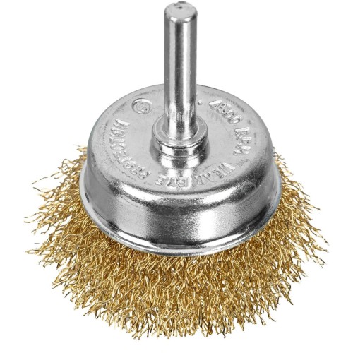 Щетка для дрели «чашка» Matrix 74475 диаметром 50 мм, со шпилькой и щетиной из латунированной витой проволоки, используется для очистки металлических, деревянных и пластиковых поверхностей от незначительных загрязнений и остатков лакокрасочных покрытий. Помогает подчеркнуть структуру материала или придать ему шероховатость. Хвостовик диаметром 6 мм устанавливается в патрон электродрели, поддерживающей скорость 4500 об/мин.