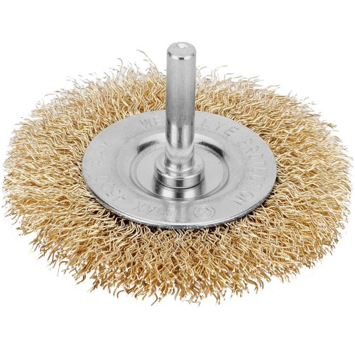 Плоская щетка для дрели Matrix 74446 диаметром 60 мм, со шпилькой и щетиной из латунированной витой проволоки, предназначена для бережной очистки металлических, деревянных, пластиковых поверхностей от загрязнений, старых лакокрасочных материалов и ржавчины. Витая проволока диаметром 0,3 мм проникает в труднодоступные места: пазы, углы, изгибы, узкие участки. Насадку применяют для придания поверхности нужной шероховатости или подчеркивания структуры материала. Хвостовик диаметром 6 мм устанавливается в патрон электродрели, способной работать на рекомендуемой скорости 4500 об/мин.