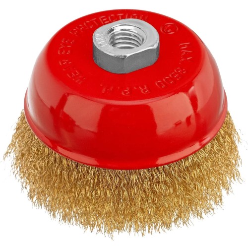 Щетка «чашка» Matrix 74605 диаметром 100 мм, с щетиной из латунированной витой проволоки, устанавливается на вал УШМ с помощью гайки М14. Предназначена для снятия тонкого слоя краски или лака, удаления ржавчины и загрязнений. При рекомендованной скорости вращения 8500 об/мин щеткой можно быстро обрабатывать участки большой площади.