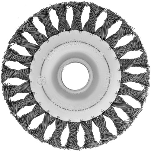 Плоская щетка Matrix 74632 диаметром 125 мм и посадкой 22,2 мм, с щетиной из крученой проволоки толщиной 0,5 мм, устанавливается на вал УШМ, поддерживающей скорость вращения не более 10000 об/мин. Эффективно удаляет загрязнения, толстый слой ржавчины и лакокрасочных материалов с поверхностей, поэтому используется для проведения грубой (черновой) обработки. Плоской щеткой удобно очищать труднодоступные места, в том числе углы и изгибы.