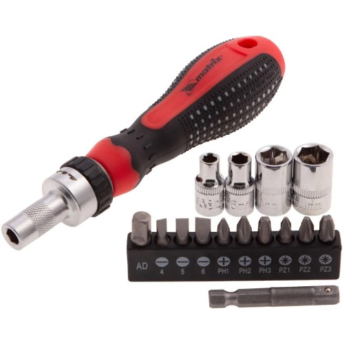 Реверсивная отвертка Matrix 11332 с набором бит и торцевых насадок из стали CrV, с присоединительным размером 1/4", 16 шт. в упаковке, предназначена для работ с резьбовыми соединениями. Благодаря торцевым головкам с адаптером может использоваться в качестве накидного ключа. Храповой механизм облегчает вращение отвертки и увеличивает скорость работы. Направление вращения можно менять при помощи кольцевого переключателя.