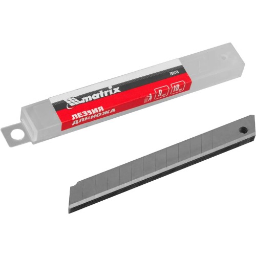 Лезвия Matrix 793115 шириной 9 мм и длиной 85 мм — сменные рабочие элементы для монтажных ножей. Подходят для разрезания картона, линолеума, пленки, обоев. Лезвия остро заточены и хорошо гнутся, могут применяться в бытовых целях, а также во время строительства и ремонта.