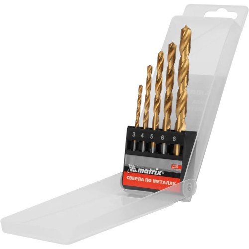Набор Matrix 72383 включает 5 нитридтитановых сверл из стали HSS, с цилиндрическим хвостовиком, упакованных в пластиковую коробку, которые используются для получения в металле отверстий диаметром 3-4-5-6-8 мм.
