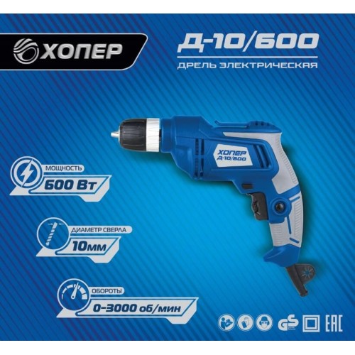 Рег.оборотов 0-3000об/мин, 600Вт, мах ф сверла 10мм, коробка