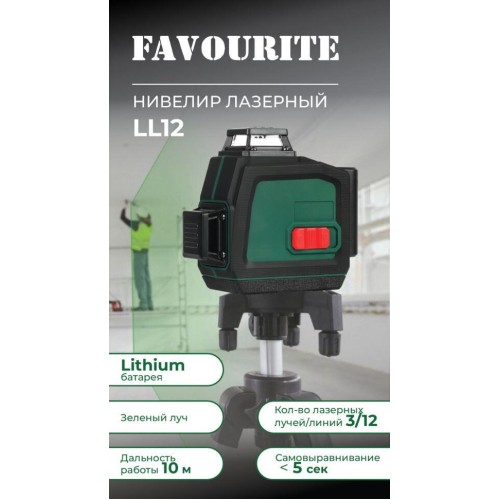 Лазерный уровень самовыравнивающийся (нивелир) FAVOURITE LL 12, 10 м, 4/12, ±1 мм / 5 м, 360°, ±3°, ˂5 сек, 515-520 нм, луч зелёный, Lithium АКБ, 1/4". В комплекте: АКБ*2 шт, ЗУ, очки защитные, пульт, платформа, адаптер для штатива, фиксатор, металл. пластина для крепления, кронштейн, пластиковый кейс.