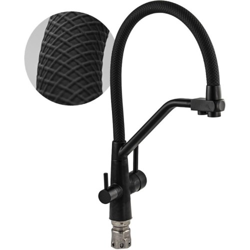 Смеситель для кухонной мойки и раковин с двойным выпуском воды для фильтра, литой чёрный корпус, из нержавеющей стали марка SUS 304, с гибким изливом чёрного цвета с фиксацией на жёстком изливе, шаровый. Крепление резьба - гайка, картридж d = мм, ручка шток. Аэратор для экономии воды. Такая модель может использоваться на домашней кухне, на даче, в медицинских учреждениях и общественных местах. Габаритные размеры: высота 420 мм, длина 300 мм, диаметр посадочного седла 45 мм, длина резьбы 60 мм, длина подводки 500 мм. Вес - 2.3 кг, объём - 0.00746 м3. В комплекте паспорт, корпус с изливом, подводка 1/2, крепеж, набор прокладок.