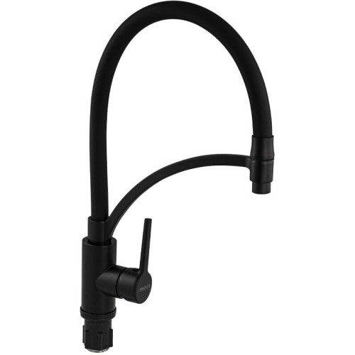 Смеситель для кухонной мойки и раковин, литой чёрный матовый корпус, из нержавеющей стали марка 304, с высоким гибким изливом чёрного цвета с фиксацией, с аэратором для экономии воды, шаровый, Крепление резьба - гайка, картридж d = 35 мм, ручка литая. Такая модель может использоваться на домашней кухне, на даче, в медицинских учреждениях и общественных местах. Габаритные размеры: высота 410 мм, длина 260 мм, диаметр посадочного седла 45 мм, длина резьбы 45 мм, длина подводки 450 мм. Вес - 2,2 кг, объём - 0,00761 м3. В комплекте паспорт, корпус с изливом, подводка 1/2, крепеж, набор прокладок