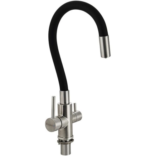 • МАГНУС 91129 Смеситель для кухни, гибкий ЧЕРНЫЙ излив, шаровый, с двойным выпуском воды для фильтра, корпус из нержавеющей стали марки 304, цвет САТИН