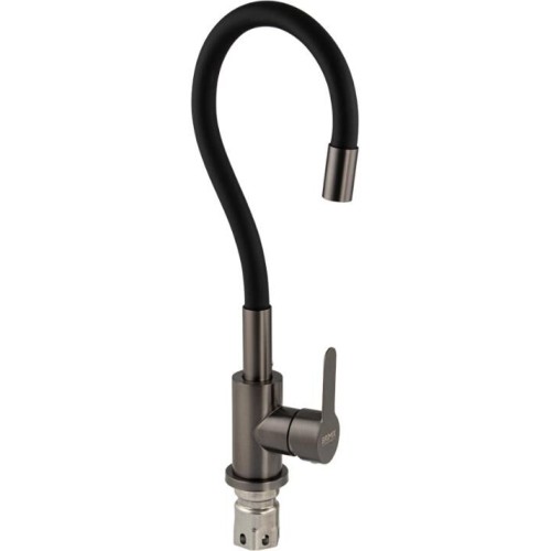 Смеситель для кухонной мойки и раковин, литой корпус цвета графит, из нержавеющей стали марки SUS 304, с высоким гибким изливом, чёрного цвета, с аэратором для экономии воды, шаровый. Крепление резьба - гайка, картридж d = 35 мм, ручка литая. Такая модель может использоваться на домашней кухне, на даче, в медицинских учреждениях и общественных местах. Габаритные размеры: высота до 400 мм, длина до 250 мм, диаметр посадочного седла 45 мм, длина резьбы 55 мм, длина подводки 400 мм. Вес - 1,700 кг, объём - 0,004 м3. В комплекте паспорт, корпус с изливом, подводка 1/2, крепеж, набор прокладок.