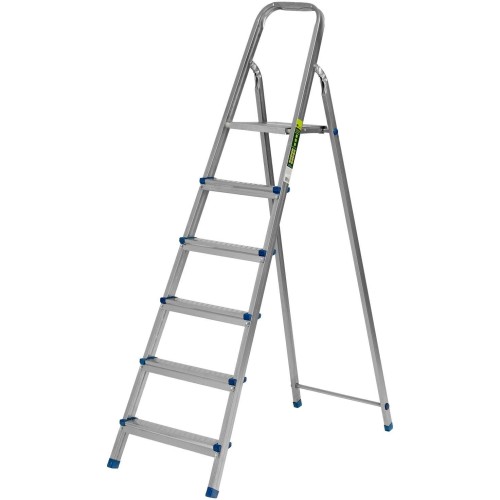 Стальная оцинкованная стремянка Сибртех 97838 с 6 ступенями позволяет повесить полку, картину или шкафчик, достать нужный предмет и решить другие задачи, для которых требуется доступ к предметам на высоте. Рама и ступени из стального профиля выдерживают вес до 120 кг. Расстояние от опорной поверхности до площадки составляет 121 см, при среднем росте пользователя 170 см рабочая высота лестницы — 321 см. Необходимо соблюдать технику безопасности: размещать стремянку только на ровной плоскости и не использовать ее для работы с дрелью, шуруповертом и другим электроинструментом.ПреимуществаПростая установка — на верхней площадке предусмотрены специальные зацепы для фиксации стремянки в разложенном состоянии.Антикоррозийная защита — стальная поверхность оцинкована, что увеличивает срок службы лестницы.Безопасное использование — рифленые ступени обеспечивают противоскользящий эффект, защитные накладки на углах исключают случайное травмирование пользователя.Аккуратное использование — ножки с противоскользящими накладками не повреждают напольное покрытие.Удобная эксплуатация — высокая дуга безопасности позволяет занять устойчивое положение.