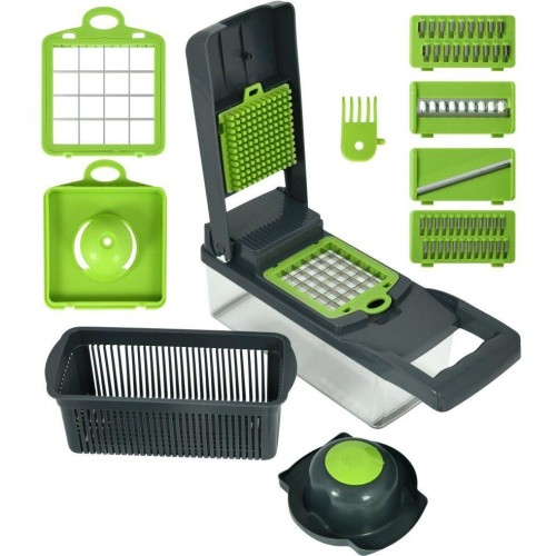 Овощерезка ручная механическая. Предназначена для шинковки и нарезки слайсами, кубиками и соломкой овощей, зелени, фруктов, грибов, яиц, сыра, колбасы. В комплекте имеется специальная насадка для натирания цедры и пюре из фруктов и овощей. Осторожно Во избежание травм об острые режущие элементы терки необходимо при нарезке и шинковке продуктов пользоваться держателем-толкателем. Комплектация: Корпус терки с отверстием, куда вставляются насадки. Контейнер для нарезанных овощей и фруктов. Также может использоваться для хранения насадок и держателя внутри. Сетчатый контейнер для сушки овощей, зелени, фруктов, ягод. Держатель-толкатель, который с помощью металлических стержней удерживает овощи под пластиковым колпаком – предохранителем, не допуская непосредственного контакта рук с режущими элементами терки. Фиксатор для нарезки кубиками на крышку. Насадка для нарезки кубиками 1х1 см. Насадка для нарезки кубиками 1,5х1,5 см. Насадка для приготовления нежных овощных смесей и сочных фруктовы