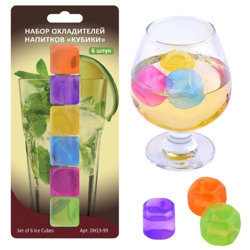 Набор охладителей «Кубики» - отличное решение для повседневного охлаждения напитков. Яркие многоразовые кубики используются для охлаждения чая, компотов, коктейлей, морсов, соков и других напитков. Преимущества многоразовых охладителей: предназначены для многоразового использования; имеют яркий дизайн, привлекательно смотрятся в напитках; имеют оптимальный размер 2,5х2,5 см, что исключает случайное проглатывание; просты в применении, достаточно подержать кубики в морозильной камере несколько часов; изготовлены из безопасного полимерного материала, заполнены дистиллированной водой. Обычные ледяные кусочки тают и оставляют мокрые следы, а кубики не протекают и не создают дискомфорта. В качестве альтернативного использования охладители можно поместить к продуктам в контейнер или к закрытым напиткам, если требуется нести их по жаре. Такой набор - идеальное решение для вечеринки с прохладительными напитками.