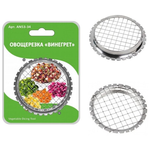 Овощерезка «Винегрет» поможет нарезать вареные овощи или фрукты кубиками. Изделие используется для нарезки салатов, для декора блюд, для приготовления закусок. Простое приспособление поможет значительно быстрее справиться с рутинной кухонной работой по нарезке овощей кубиками. Основные характеристики: материал изготовления – нержавеющая сталь. Не вступает в реакцию с продуктами, не выделяет запахи, не ржавеет; режущая часть – струна. Изделие безопасно, поскольку отсутствуют острые лезвия. Струн достаточно для нарезки вареных овощей и мягких свежих, он не затупится и не порвется со временем; овощерезка имеет квадратные ячейки 6х6 мм. После использования промыть мягкой щеткой или губкой, можно с использование жидких моющих средств. Овощерезка не занимает много места, ее можно хранить в шкафчике, на полке и где угодно. Ухаживать за изделием просто – после применения промывайте в проточной воде с моющими средствами.