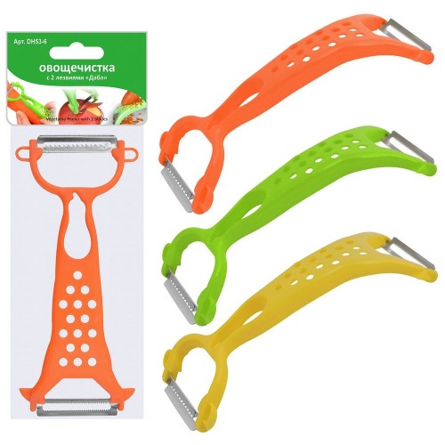 Используйте овощечистку «Дабл» для очистки овощей и фруктов от кожуры и для нарезки их тонкими ломтиками для чипсов или декорирования блюд. Инструмент выполняет несколько функций: эффективно очищает от кожуры; позволяет нарезать продукты очень тонкими ломтиками; с помощью дырочек на корпусе вы можете протереть мягкие продукты в пюре; вырезает глазки с помощью специальных выступов на корпусе. Изделие изготовлено из пластмассы (полипропилен) и коррозионностойкой (нержавеющей) стали, имеет простой дизайн и удобно в применении. Мыть овощечистку легко – достаточно проточной воды и капли жидкого средства.