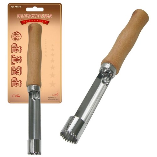 Почистить яблоко не так уж и сложно, но, когда нужно переработать большой объем фруктов или приготовить яблоки для детей, на помощь приходит яблокорезка «Ретро». Инструмент аккуратно удаляет сердцевину и подходит для плодов любого размера. Изделие работает по принципу пробойника — вы ставите его зубчатым концом в область плодоножки и продавливаете на всю длину, затем вытаскиваете лезвие вместе с сердцевиной. Если яблоко твердое, можно прокрутить вокруг своей оси для более легкого извлечения. Изготовлено: рабочая часть из коррозионностойкой (нержавеющей) стали, ручка из дерева. После применения вымыть мягкой щеткой или губкой, можно с использованием жидких моющих средств.