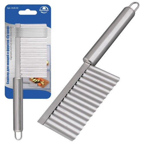 Слайсер для овощей и фруктов украсит ваш праздничный стол красиво нарезанными овощами и фруктами. Станет вашим незаменимым помощников при нарезке не только овощей и фруктов, но и сыра. Волнистые ломтики продуктов будут смотреться очень красиво и привлекут внимание ваших гостей и домочадцев к трапезе. Перед первым использованием и после каждого применения промыть в проточной воде мягкой щеткой или губкой с жидким моющим средством, просушить. Можно мыть в посудомоечной машине. Общая длина 22 см, длина лезвия 10см. Изготовлено: коррозионностойкая (нержавеющая) сталь.