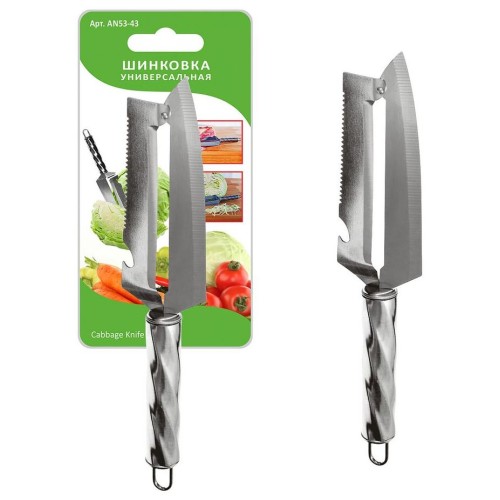 Используйте шинковку для нарезки капусты и других овощей. Инструмент поможет вам быстро нашинковать капусту для салата, супа, а также для заготовок. Изделие состоит из 2-х острых лезвий, что значительно сокращает время нарезки и экономит ваши силы. Изделие выполняет несколько функций — позволяет нарезать капусту, овощи, сыр, а также используется в качестве открывалки для бутылок. Заостренный кончик позволяет удалять глазки и трещины. Шинковка удобна в использовании. Инструмент изготовлен из коррозионностойкой стали. Длина 25 см. После использования мойте нож в проточной воде с моющими средствами.