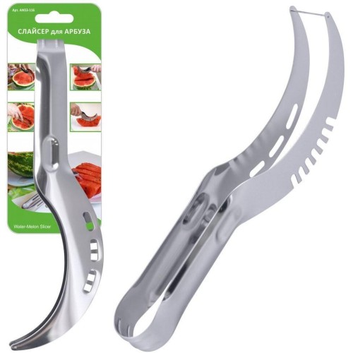 Уникальная конструкция слайсера позволит быстро и аккуратно порезать арбуз на ровные и одинаковые по толщине ломтики. С помощью слайсера вы извлечете только самую вкусную часть арбуза — мякоть. Приспособление служит еще и щипцами, с помощью которых можно захватить порезанные ломтики и перенести их на тарелку. Изделием просто пользоваться, гораздо удобнее, чем нарезать ломтики ножом. Сервируйте стол этой ароматным арбузом быстро, красиво и аккуратно Длина 23,5 см. Изготовлено из коррозионностойкой (нержавеющей) стали.