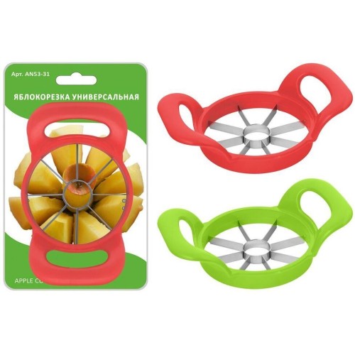 Универсальная яблокорезка предназначена для быстрой и удобной нарезки яблок и удаления сердцевины. Всего одним нажатием вы разрежете фрукт на ровные дольки, отделив при этом сердцевину. Очень удобный инструмент для нарезания яблок для подачи на стол, для угощения детей или на заготовки. Поставьте яблоко на горизонтальную поверхность, прижмите инструмент так, чтобы центр оказался в области сердцевины. С усилием надавите и ваши дольки готовы После использования промойте инструмент в проточной воде с жидкими моющими средствами. Храните в сухом месте. Изготовлено: рабочая часть из коррозионностойкой (нержавеющей) стали, корпус из пластмассы (ABS).