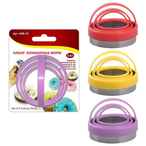 Существует множество приспособлений для домашней выпечки и работы с тестом. Для того, чтобы вырезать кружочки из теста для приготовления печенья, домашних вареников, пончиков и других изделий, используйте набор кулинарных форм с разными диаметрами. Изделия выполнены в виде круга с пластмассовой окантовкой и ручкой. Металлический край формы достаточно острый, чтобы вырезать кружок из теста, при этом он абсолютно безопасен. Кулинарная форма изготовлена из коррозионностойкой стали, окантовка и ручка из пластмассы (полипропилен).