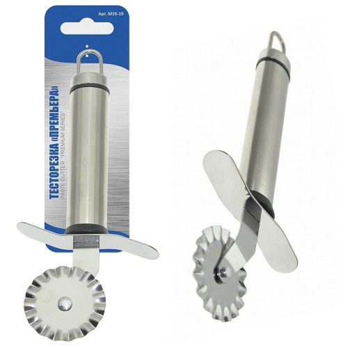При приготовлении блюд из теста удобно пользоваться специальной тесторезкой «Премьера». Ролик быстро нарежет тесто на порции для чебуреков, пельменей, печенья, домашней лапши. С его помощью кондитеры удаляют остатки мастики после обтяжки торта. Лезвие имеет особую форму, позволяющую получать фигурные края при нарезке, это особенно популярно при приготовлении равиоли. Длина 18,5 см. Тесторезка изготовлена из коррозионностойкой (нержавеющей) стали. После применения рекомендуется мыть мягкой щеткой с использованием жидких моющих средств.