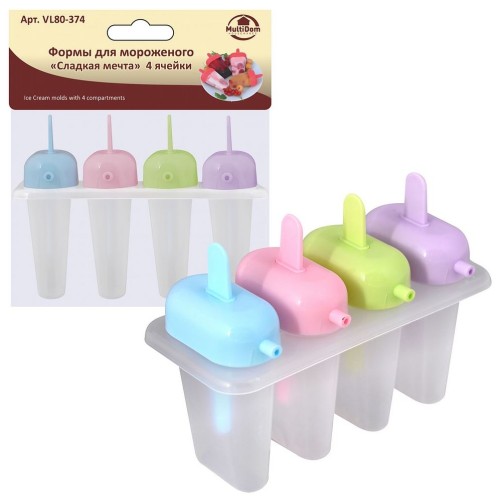 Домашний фруктовый лёд или молочное, йогуртовое мороженое – это не только вкусное, но и полезное лакомство. Смешивайте любимые вкусы, фантазируйте, устраивайте эксперименты и радуйте своих близких угощением с формами для мороженого. Формы позволяют одновременно приготовить 4 порции освежающего десерта. Формы выполнены в классическом дизайне, крышки-палочки удобно держать в руках. Сама форма продумана так, чтобы мороженое было легко доставать. Перед первым использованием и после каждого применения помыть в тёплой воде, можно с жидким моющим средством, сполоснуть проточной водой и просушить. Можно мыть в посудомоечной машине. Изготовлено из пластмассы (полипропилен). Размер: 15,5х7х11 см. Длина крышки-палочки 9 см. Объём ячейки 50 мл.