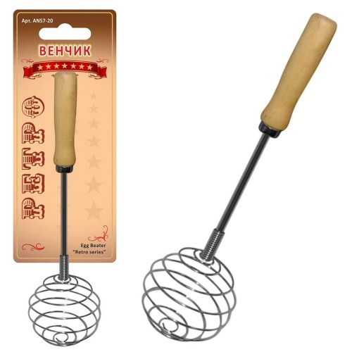 Венчик — удобное и бесшумное приспособление для взбивания крема, сливок, соусов, теста. Иногда использование миксера не имеет смысла, например, когда объемы продуктов небольшие или нужно добиться определенной консистенции вручную. Венчик «Ретро» имеет проверенную временем форму, позволяет за короткое время качественно взбить продукты. Инструмент имеет длинную удобную ручку, хорошо лежит в руке. Рабочая часть изготовлена из нержавеющей стали, ручка выполнена из дерева. Изделие занимает мало места и удобно в хранении. После использования промывайте теплой водой с моющими средствами.