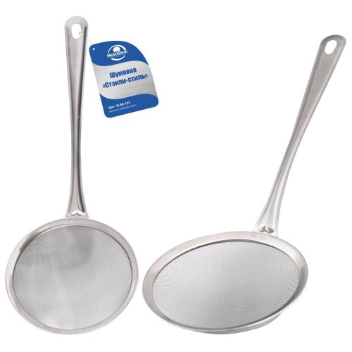 Шумовка используется для снятия пенки с готовящихся супов, бульонов, варенья. Шумовка удобна для помешивания, а также для раскладывания вареников и пельменей по тарелкам. Шумовка «Стэнли-стиль» подойдет к любому интерьеру, ее можно хранить на крючке рядом с зоной приготовления пищи. Общая длина 34см, диаметр рабочей части 13,5см. Перед первым использованием и после каждого применения промыть в проточной воде мягкой щеткой или губкой с жидким моющим средством, просушить. Можно мыть в посудомоечной машине. Изготовлено: коррозионностойкая (нержавеющая) сталь.