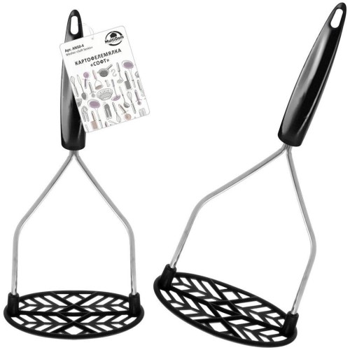 Использование картофелемялки делает пюре мягким и воздушным. Если под рукой нет блендера, картофелемялка «Софт» станет для вас незаменимым помощником. Инструмент имеет классическую конструкцию — толкушку с прорезями и ручку. Равномерно нажимайте рабочей частью на вареные овощи и мните до тех пор, пока не добьетесь равномерной консистенции. Рабочая часть изготовлена из пластмассы (нейлон), что дает большое преимущество этой модели при работе с антипригарной посудой. Нейлон рассчитан на высокие температуры, следовательно, не будет портится при взаимодействии с горячими продуктами. Ручка из хромированной стали удобна в использовании, имеет отверстие, за которое можно повесить изделие на крючок.