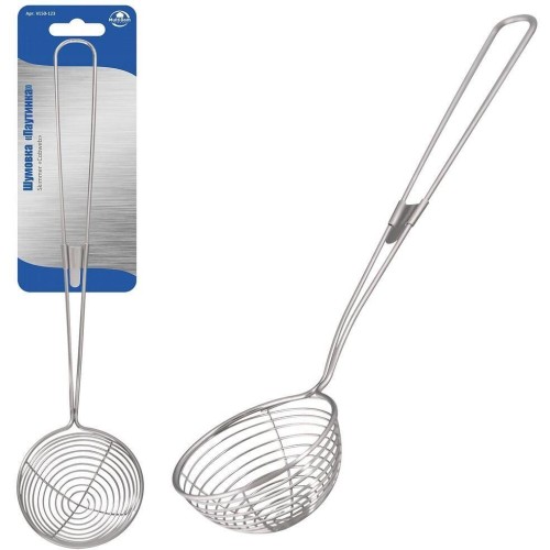 Шумовка — необходимое приспособление на кухне у каждой хозяйки. С её помощью снимается пенка с готовящихся бульонов, варенья. Шумовка пригодится при варке пельменей, вареников и различных овощей. Также шумовка используется при жарке овощей и других блюд во фритюре. Шумовка подойдёт к любому интерьеру, её можно хранить на крючке рядом с зоной приготовления пищи, и она всегда будет у вас под рукой. Перед первым применением и после каждого использования рекомендуется вымыть губкой или мягкой щёткой, можно с жидким моющим средством, сполоснуть проточной водой и просушить. Можно мыть в посудомоечной машине. Изготовлено из коррозионностойкой (нержавеющей) стали. Диаметр рабочей части 6,5 см, общая длина 27 см.
