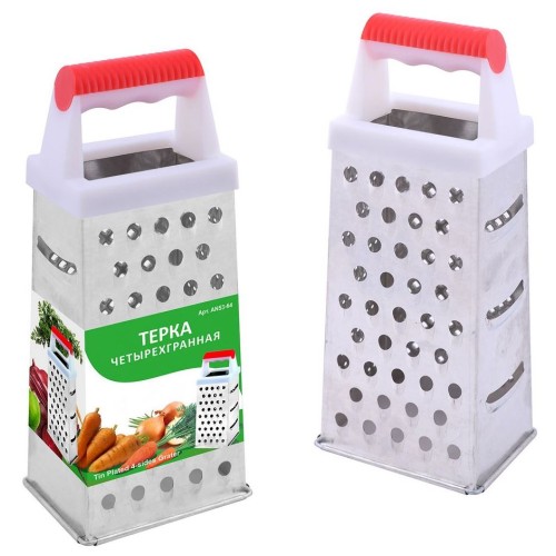 Четырехгранная терка – удобное кухонное приспособление с отверстиями и насечками четырех типов. По двум сторонам расположены крупная и мелкая терки для моркови, лука, яиц, картофеля. Мелкие острые отверстия нужны для получения цедры. Сторона с тремя крупными отверстиями предназначена для нарезки тонких ломтиков овощей или фруктов. Поставьте терку на стол, одной рукой держите за ручку. Второй рукой возьмите продукт, прижмите к нужной вам грани и начинайте тереть, направляя движения вниз. Натирайте только крупные части продуктов, чтобы не повредить пальцы. Рабочая поверхность четырехсторонней терки выполнена из коррозионностойкой стали, ручка – из пластмассы, высота изделия 19 см. Уход за изделием прост: после использования промывайте водой, удаляя щеткой пищевые отходы.