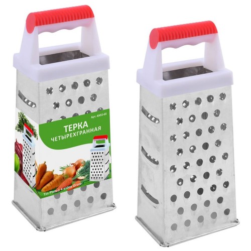 Измельченные продукты кладутся в большое количество блюд – в салаты, супы, выпечку, кондитерские изделия. Часто приходится натирать сыр, морковь, яйца, крутое тесто для пирогов, цедру и многое другое. По двум сторонам изделия расположены крупная и мелкая терки для картофеля, лука, моркови, яиц. Для получения цедры предусмотрены мелкие заостренные отверстия, самые крупные отверстия предназначены для нарезки ломтиками. Чтобы натереть продукты, установите терку на стол и прижмите для устойчивости. Чтобы не повредить пальцы, натирайте только крупные части продуктов. Рабочая поверхность четырехсторонней терки выполнена из стали с коррозионностойким покрытием, ручка из пластмассы (полипропилен), высота 22 см. Уход за изделием прост: после использования промывайте водой, удаляя щеткой пищевые отходы.