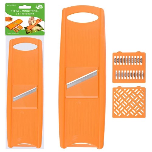 Для измельчения овощей и фруктов идеально подойдет терка с 3 насадками «Мини Трио». В комплект входит корпус-основа и три насадки. Слайсер ножами-вставками из металла используется для нарезки овощей ломтиками и шинковки капусты. Вторая насадка применяется для приготовления пюре из мягких овощей и фруктов. С помощью третьей нарезается корейская морковь, соломка из кабачков, свеклы, редьки, огурцов. Пользоваться приспособлением просто – вставьте насадку в корпус и используйте как обычную терку. Будьте осторожны с мелкими частями продуктов. Терка с насадками станет отличным помощником при приготовлении повседневных и праздничных блюд. Лезвия терки изготовлены из нержавеющей стали, корпус из пластмассы. Материалы полностью безопасны, не вступают в реакцию с пищевыми продуктами. Прочная пластмасса и нержавеющая сталь прослужат долго. Терка для овощей — универсальный помощник для приготовления повседневных и праздничных блюд. Универсальная терка полноценно заменит несколько кухонных гаджетов