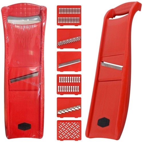 Терка с 6 насадками используется для измельчения овощей и фруктов. В комплект входит: 1. Корпус терки с отверстием, куда вставляются насадки. 2. Шесть насадок: 5 из пластмассы с металлическими ножами-вставками, 1 насадка из пластмассы (для фруктовых пюре и овощных смесей). Насадки предназначены: 1) для нарезания тонких ломтиков из овощей, фруктов и шинковки капусты, 2) для нарезки крупных и мелких брусочков из картофеля (картофель-фри), 3) для корейских салатов, нарезки моркови, свеклы, редьки, огурцов, 4) для приготовления нежных овощных смесей и сочных фруктовых пюре. Изготовлено: пластмасса (полипропилен), коррозионностойкая (нержавеющая) сталь. Размер 35х11 см.