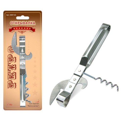 Модель универсальной открывалки знакома всем с детства. Кухонная классика в ретро-концепции станет незаменимым помощником для открывания консервных банок и бутылок. Приспособление не имеет сложных механизмов, его практически невозможно сломать или повредить. Преимущество модели в наличии штопора, который складывается и убирается в специальный отсек. Пользоваться изделием просто: приготовьте банку и поставьте ее на стол; возьмите открывалку и поставьте острым концом на край крышки; одной рукой держите нож за ручку, другой ударьте, чтобы получилась дырка; центральной частью держитесь за бортик банки, острием прорезайте металл по кругу; крышку осторожно отогните руками. Для бутылок используйте маленькое закругленное лезвие, цепляйте им за край крышки и аккуратно дергайте наверх. Лезвия и корпус изготовлены из стали с хромированным покрытием. Открывалка для консервных банок не нуждается в особом уходе, после использования достаточно промыть проточной водой и высушить.