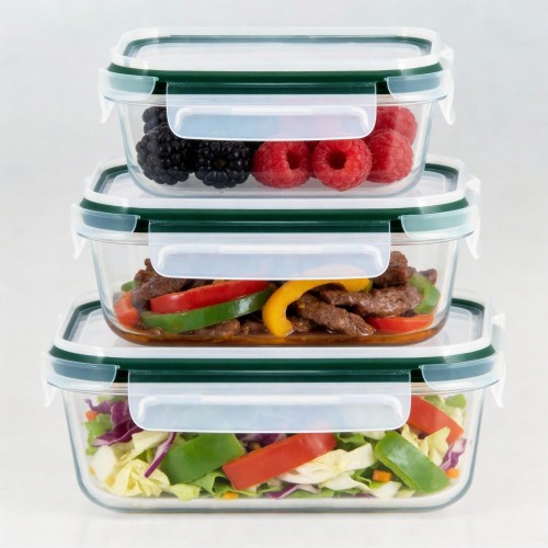 Набор стеклянных контейнеров: 370мл, 640мл,1040 мл; Герметичные крышки; Не впитывает запахи; Термостойкое стекло; Размеры: 15*10,9*5,7 см; 17,4*12,8*6,5 см; 20,2*15,2*6,9 см; Подходит для микроволновой печи; Выдерживает температуру: от -20°С до 400°С; Можно использовать в качестве формы для запекания; Можно мыть в посудомоечной машине; Eco Friendly