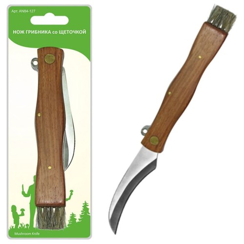 Складной нож предназначен для походов за грибами. Тонким изогнутым лезвием удобно срезать и очищать грибы. Щёточка помогает очистить ножку гриба от земли и травы, а шапочку от налипших листьев и загрязнений. Не нарушает целостность гриба и не царапает. Также имеется петля, позволяющая закреплять нож на ремне или корзине с помощью шнура или карабина. Перед первым и после каждого применения, промыть в тёплой воде, можно с жидким моющим средством, сполоснуть проточной водой и просушить. Не рекомендуется мыть в посудомоечной машине. Изготовлено: лезвие из коррозионностойкой (нержавеющей) стали, накладные детали рукоятки из дерева, щёточка из натуральной щетины. Размер: длина ручки 14 см, длина лезвия 7 см.