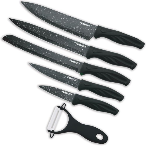 Набор кухонных ножей из 6 предметов: Шеф-нож, Нож для хлеба, Нож для нарезки, Универсальный нож, Нож для чистки овощей, Керамическая овощечистка. Специализированная японская сталь для ножей 420J2 . Твердость стали по шкале Роквела 52±2 HRC. Двусторонняя заточка лезвий. Угол заточки лезвий 15°. Легкое восстановление остроты ножей даже бытовыми ножеточками. Дополнительное декоративное покрытие с антикоррозийным эффектом. Эргономичная пластиковая ручка . Упаковка с пластиковым ложементом сохраняет заточку ножи при транспортировке.