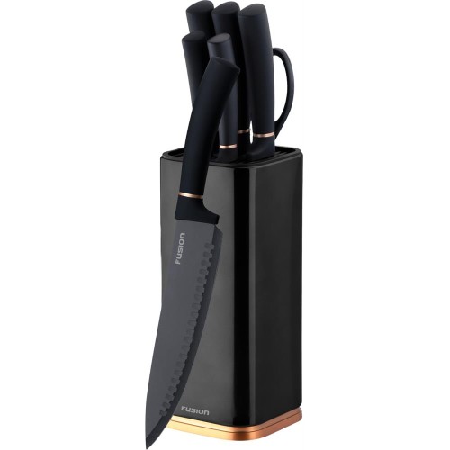 Набор из 5 кухонных ножей с подставкой и ножницами: Шеф-нож, Нож для хлеба, Нож-сантоку для нарезки, Большие кухонные ножницы, Универсальный кухонный нож, Короткий Нож для чистки овощей, Подставка с металлическим корпусом. Специализированная японская сталь для ножей 420J2. Твердость стали по шкале Роквела 52±2 HRC. Двусторонняя заточка лезвий Угол заточки лезвий 15°. Легкое восстановление остроты ножей даже бытовыми ножеточками Дополнительное декоративное покрытие с антикоррозийным эффектом. Эргономичная пластиковая ручка. Металлическая подставка с функцией сохранения остроты лезвий Кухонные ножницы в комплекте. Цвет - черный