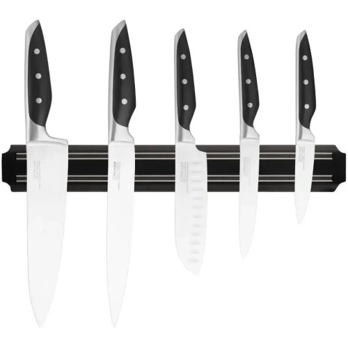 Набор ножей. Клинок ножа – высококачественная нержавеющая сталь Х30Cr13. Двухстороняя заточка. Жесткое трехклепочное крепление рукоятки. Эргономичный настенный магнитный держатель. Состав набора: Нож поварской 20 см, Нож Santoku 12,7см, Нож для разделки 20 см, Нож универсальный 12,7 см, Нож для чистки 9 см.