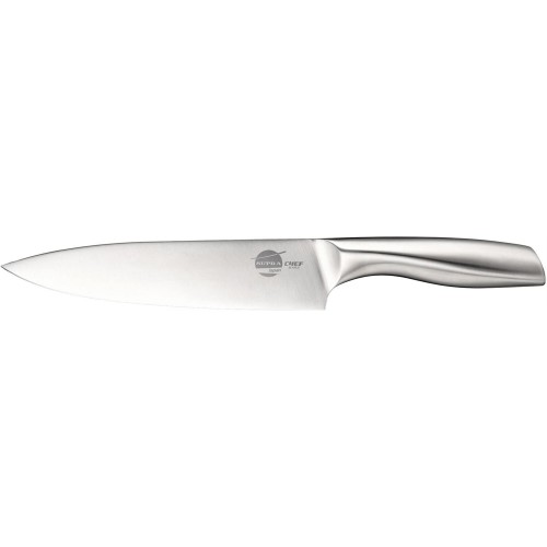 Нож кухонный шеф из нержавеющей стали Японская технология изготовления ножей Нержавеющая сталь SS 3CR13 Цельнокованый клинок Двусторонняя заточка лезвий Длина лезвия: 200 мм Длина рукояти: 125 мм Материал рукояти: нержавеющая сталь Не рекомендуется мыть в посудомоечной машине